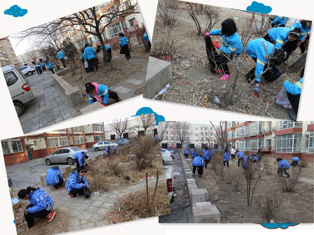 在团委书记刘丽娜、大队辅导员董君的带领下,学生们不畏严寒,着装整齐,高举团旗、队旗步行来到吉林师大社区。在社区负责人的指引下,同学们分成两个小组沿着小区的外墙、甬路、树丛捡拾起白色垃圾,开始了清扫活动。虽然天气特别寒冷,但学生们的劳动热情丝毫不减,他们不怕脏不怕累、任劳任怨、一丝不苟的清捡着小区里的烟头、塑料袋、纸屑等白色垃圾。