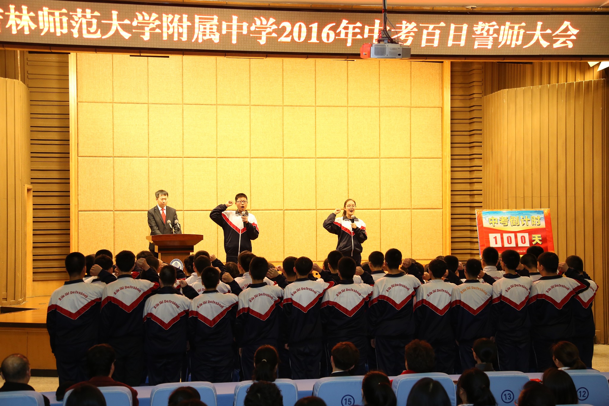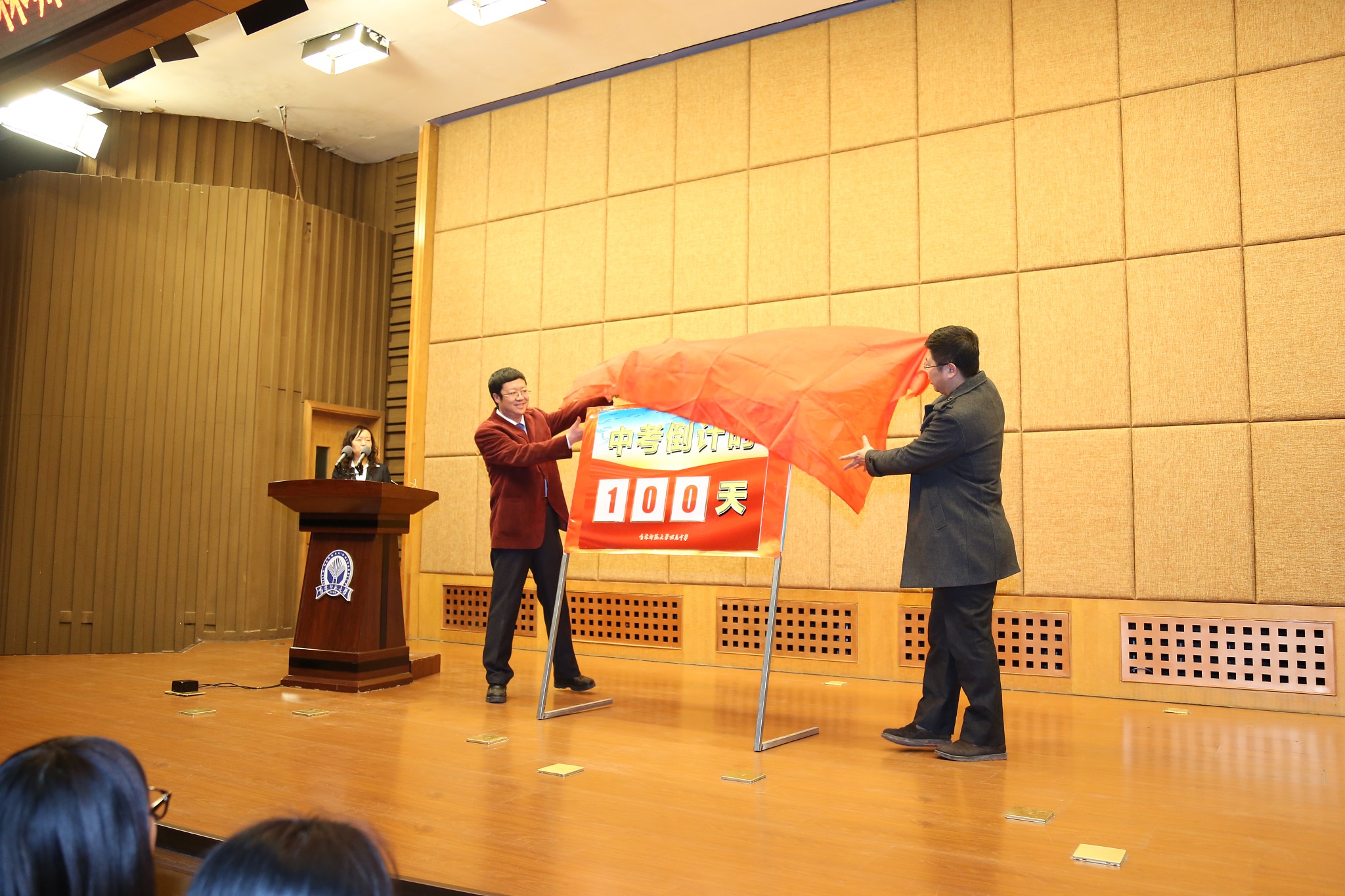 大会第二项,由吉林师大附中附小校长李峰和附中副校长闵红佳为“2016年中考倒计时100天”揭牌。