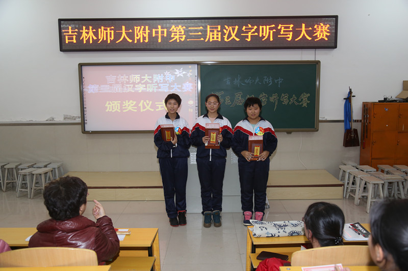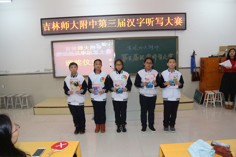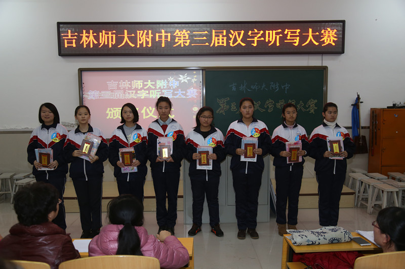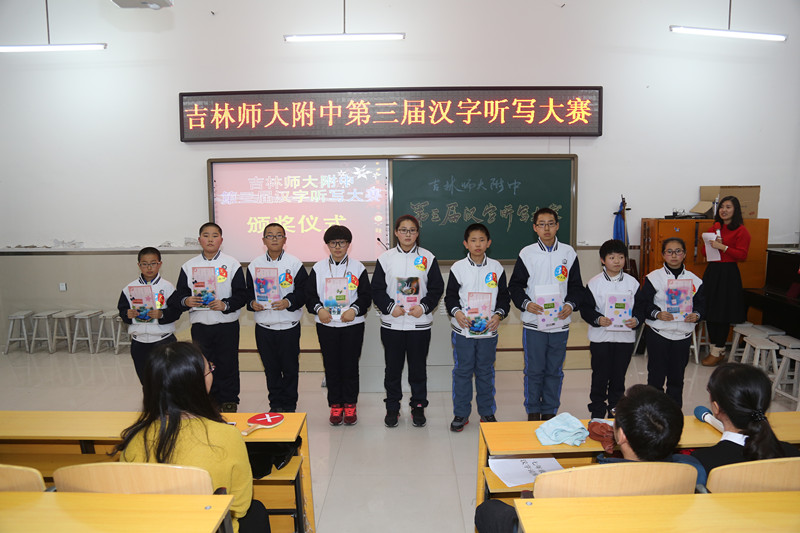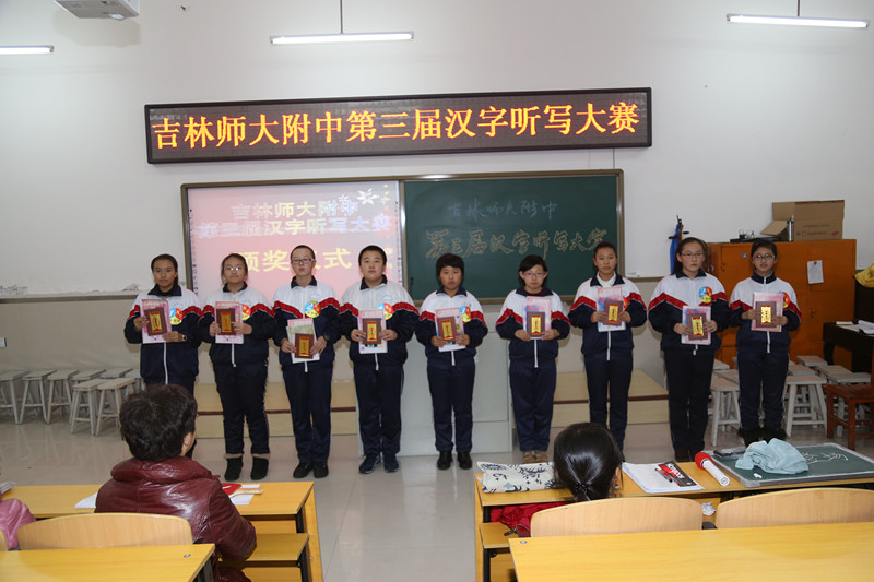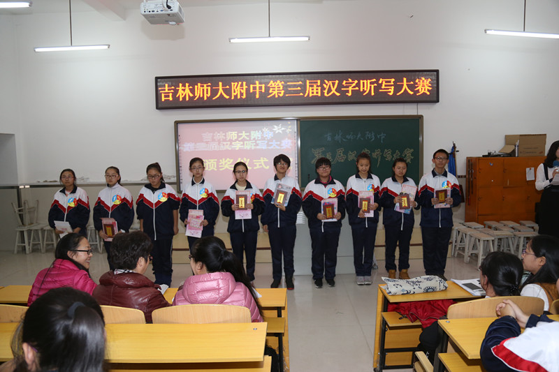 为感悟汉字底蕴,弘扬中国文化,营造健康向上的校园文化氛围,激发学生学习汉字的热情,吉林师大附中教务处于12月2 日、3 日下午在阶梯教室举办了第三届七、八年级汉字听写大赛,附中附小校长李峰、附中附小副校长孙阳华、附中副校长吴成学、教务处主任陈艳杰、成秀琴及语文学科老师和七、八年级各班学生代表到现场观看了比赛。