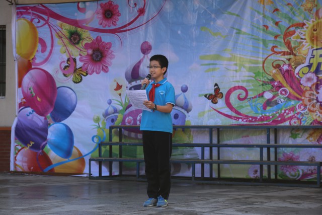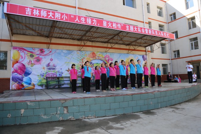 在大队辅导员邹老师的带领下,队员们进行了庄严的宣誓。随后由一.二中队的刘梓同同学代表新队员讲话,她在表达喜悦心情的同时也说出了自己的决心;新一届大队委员会大队长苏歆代表2015届大队委员会及全体老队员致词;接着由一.一中队侯中源同学的爸爸侯大明代表家长对新队员表达祝贺的同时也对所有新队员提出期望;最后刘颖校长希望新队员能通过自己的努力成为师大附小的骄傲,希望孩子们能在附小这个大家庭中健康快乐地成长,对各位辅导员也提出要求——要一如既往地把爱心和热心献给孩子们,做少先队员的引路人,同时也希望家长能和老师一起共同激励孩子发展,帮助孩子获得成功。
