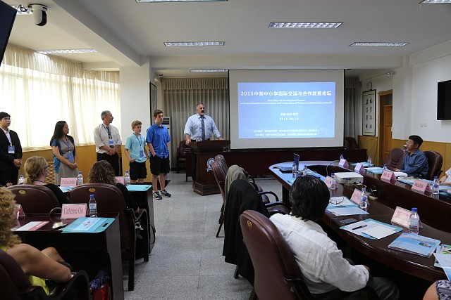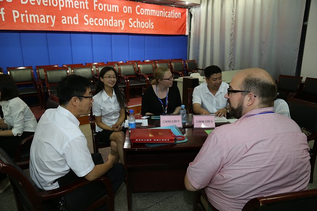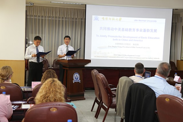 中美中小学校长正式论坛于当日下午13:00在bat365平台官网第一教学楼八楼会议室举行。会议由吉林省对外汉语教学培训中心梁琳主持。杨景海校长、郁建春局长和胡仁友处长分别做了主题发言,从各自角度谈了对中美教育差别的理解和对国际合作交流重要性认识。在自由发言环节中,美方的两名中学校长及两名孔子学院的美国学生、中方的吉林师大附中和地直街小学分别代表双方发言。