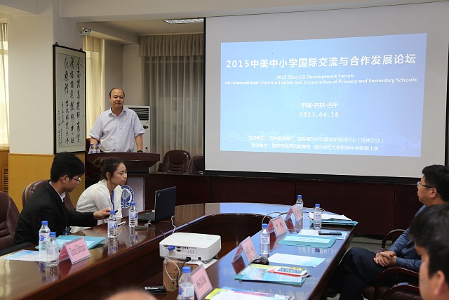 为推动中美两国的教育和文化交流,促进四平市基础教育阶段的国际合作办学,6月18日,由吉林省教育厅主办的“2015中美‘中小学国际交流与合作’发展论坛”在bat365举行。美国明尼苏达州教育官员及中小学校长一行17人、吉林省教育厅国际合作与交流处胡仁友处长、四平市教育局李丽欣副局长、铁西区教育局郁建春局长以及铁西区各中小学校长代表参加了此次论坛。bat365平台官网校长杨景海教授作为特邀嘉宾出席会议。