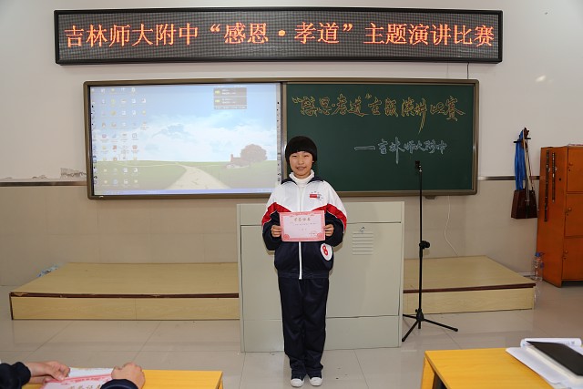 为了进一步传承孝道文化及感恩思想,让学生学会“孝”,学会感恩,激发他们感谢父母,感谢老师,感谢同学的意识,吉林师大附中于4月21日、22日在音乐教室举行了第二届演讲比赛。本次活动由附中政教处主办,附中附小副校长孙阳华、附中副校长闵红佳、政教处主任张铁刚及各学科老师和七、八年级各班学生代表到现场观看了比赛。