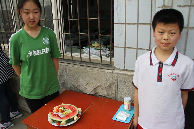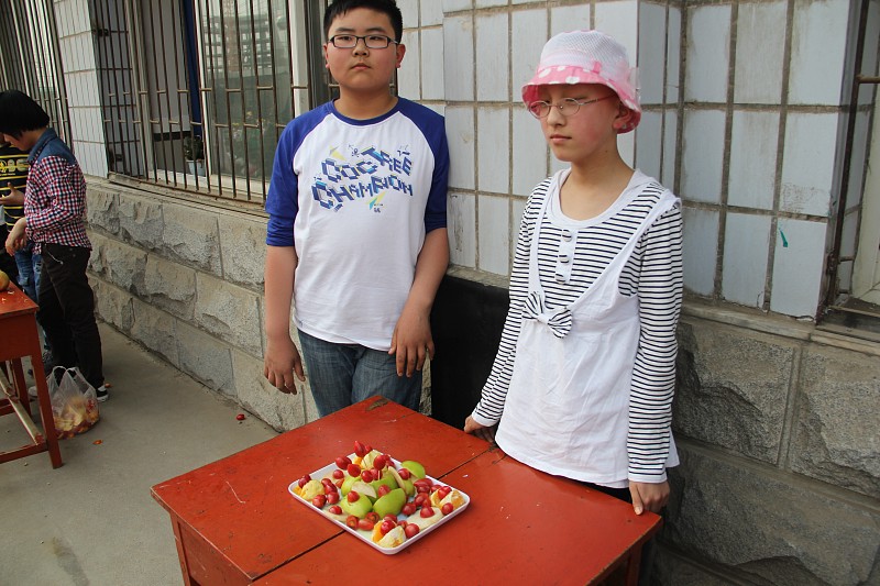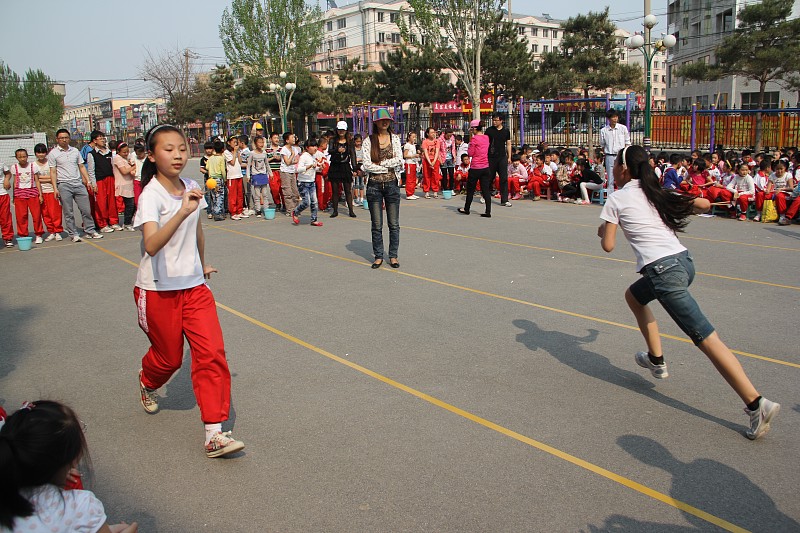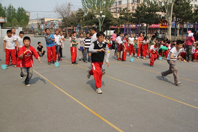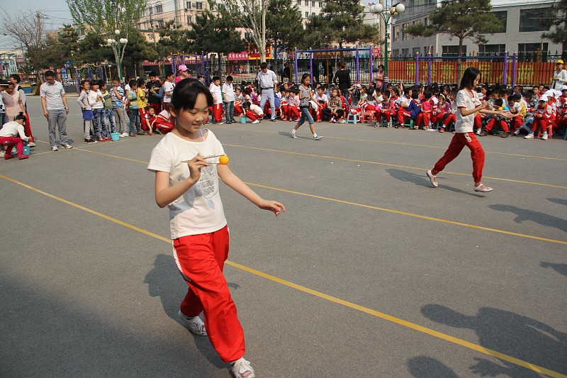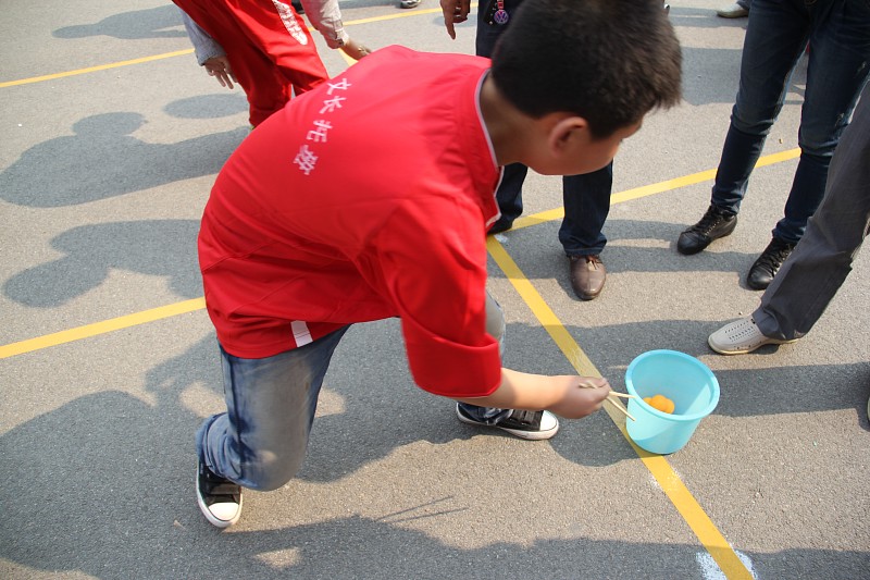 首先进行的是二年级的系红领巾、三年级的叠衣服和五年级的包书皮比赛。参赛选手们在规定的时间内,都较好地完成了比赛项目。尤其是五年级的同学们,把书皮包得非常精美。接下来进行的是一、二年级同学们的穿衣服比赛。看到低年级的小同学们穿衣服时的神情,真的很可爱!有的小同学看到别人已经跑到终点,也迫不及待地连鞋带还没有系好就奔向终点。最后进行制作水果拼盘和紧张激烈的运鸡蛋比赛。运鸡蛋实际是用筷子从一个小桶里夹出一个乒乓球运到十米外的另一个小桶里,在规定的时间内,全班共六名参赛选手运的乒乓球的总数最多者获胜。随着运鸡蛋比赛的结束,场外的水果拼盘也制作完毕。孩子们的比赛结束后,老师们也按捺不住兴奋的心情,学校又增加了教师运鸡蛋比赛。