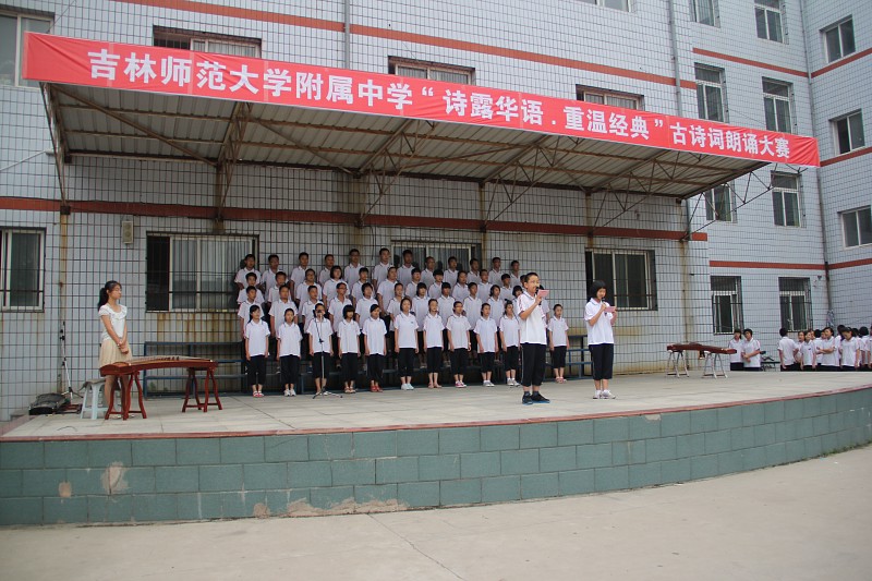 为弘扬中华民族灿烂文化,提升学生的欣赏品味和审美情趣,丰富校园人文底蕴,在附中教务处和语文组的精心组织下,吉林师大附中于7月10日上午,举行了“湿露华语,重温经典”古诗词诵读大赛。