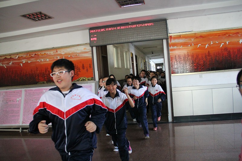 15点50分,警报声响彻了整个校园,七、八、九年级的各班同学按照“从上到下,就近疏散”的原则,快速而有序地在班主任的带领下跑到了操场指定位置,整个演练过程快而不乱,紧张而有序。近2000人的疏散第一次用时3分50秒,第二次用时3分30秒,达到了安全疏散的预期效果。