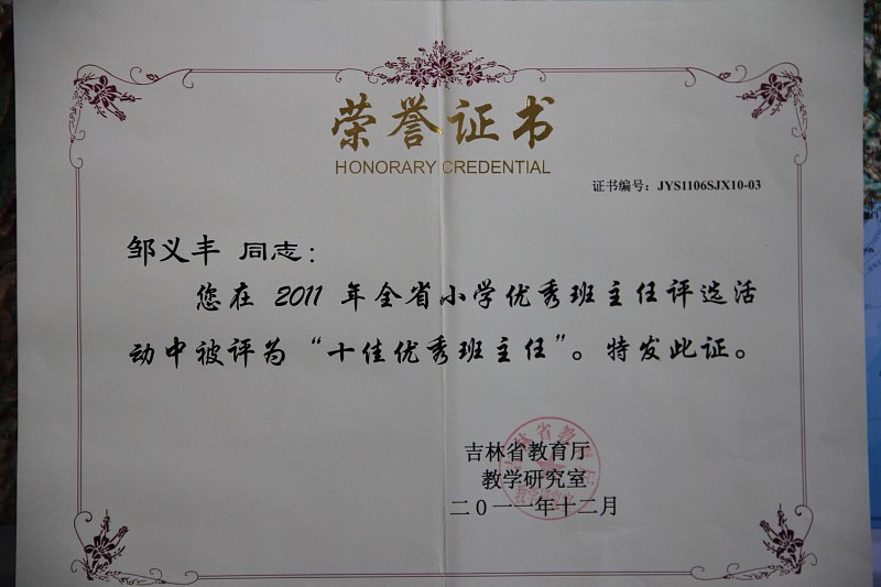 bat365邹义丰老师在吉林省教育厅、吉林省教育学院组织的“2011年全省小学优秀班主任”评选活动中被评为“十佳优秀班主任”称号。