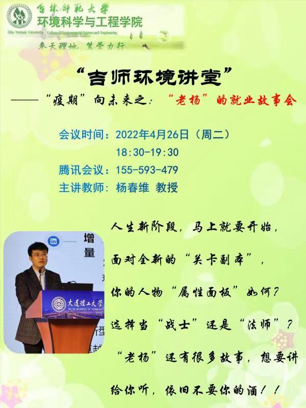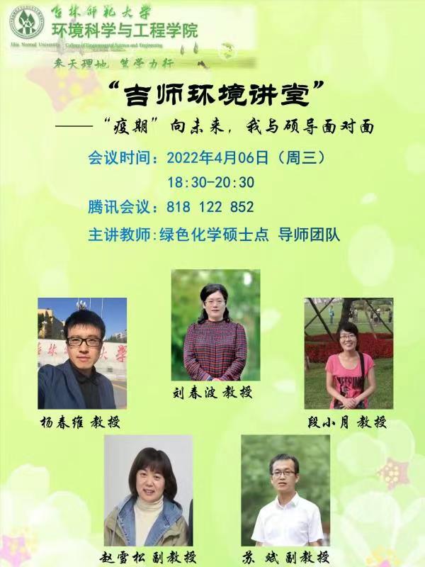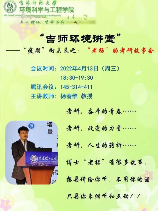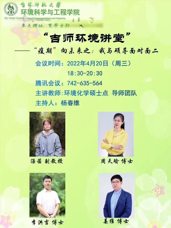 本学期开始不久,受到疫情影响学院教学、科研等常规工作都进入了特殊管理状态,为了在疫情期间稳定学生和教职员工情绪、保证学院研究生调剂与招生工作顺利开展、改变和突破学生固有保守就业思维、促进教师学术交流和科研成果转化,学院利用“吉师环境讲堂”平台,举办了题为“疫”期向未来系列活动,共举办六次网络主题讲座,分别为两次题为“我与硕导面对面”的系列硕士招生宣传和学术交流活动;两次题为“老杨的考研故事会”与“老杨的就业故事会”系列考研就业宣传活动;还特别邀请了中科院北京环境生态研究中心赵旭研究员与河北科技大学环境科学与工程学院副院长刘春教授做了题为“水中氮磷的电化学去除研究”、“微气泡技术在废水处理中的应用研究”的系列学术成果及转化交流讲座,随着本学期期末的临近和疫情形势的缓解,本次“疫”期向未来系列活动圆满收官。