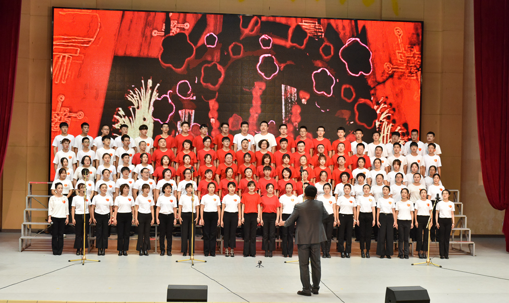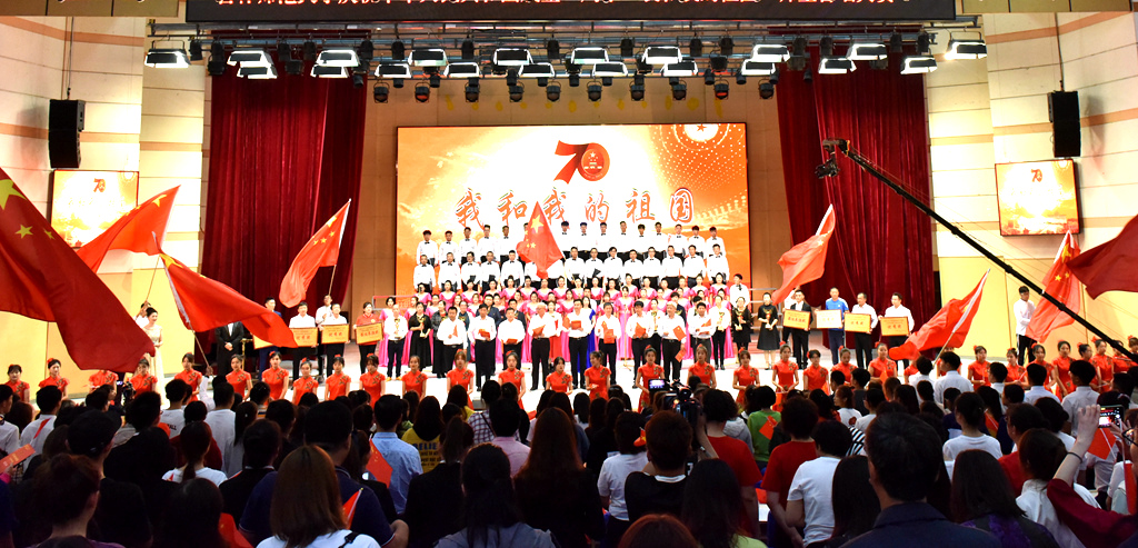 大赛在学校职工合唱团倾情演唱的歌曲《我爱你中国》中拉开帷幕。《我和我的祖国》《走进新时代》《走向复兴》《红旗飘飘》《共筑中国梦》,一首首主题鲜明、催人奋进的歌曲,唱出了全校师生不忘初心、牢记使命,永远跟党走,永远和祖国共命运的坚定决心。外国语学院合唱团朗诵慷慨激昂,歌曲明快悠扬,临近结尾的一声“我爱你,中国”更是抒发出祖国儿女对母亲的无比热爱。大学外语部合唱团以激情的朗诵和响亮的歌声表达对祖国70年光辉成就的满满自豪,展现了中国人民奋发进取,走向复兴的有力步伐。“五星红旗迎风飘扬,胜利歌声多么响亮……”经法学院合唱团用激情澎湃的歌声讴歌新时代,高擎的鲜艳国旗汇成了美丽的红色海洋,向中华人民共和国成立70周年华诞献礼。最后,大赛在校领导和全场师生《歌唱祖国》的嘹亮歌声中,在“亲爱的祖国,生日快乐”的深情祝福中圆满落幕。