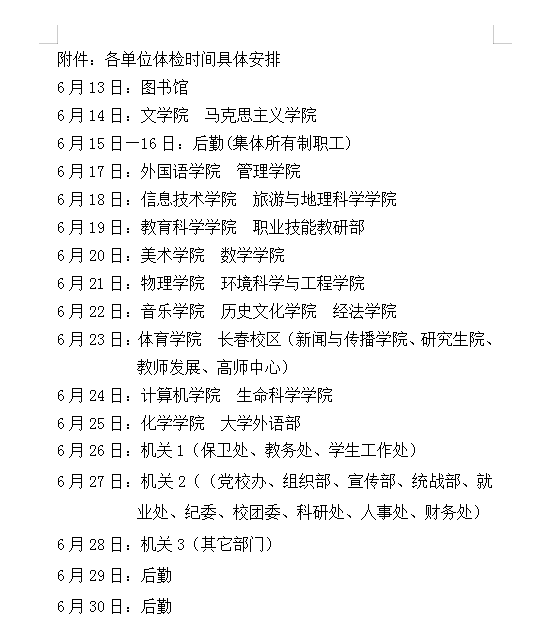 5.请各单位认真做好组织、宣传教育工作,按照指定时间进行体检,不得提前参检,逾期联系校医院另作安排。体检工作体现了学校对教职工的关怀,坚决杜绝冒名顶替现象,如有违反规定,将严肃追究教职工本人及单位领导责任。