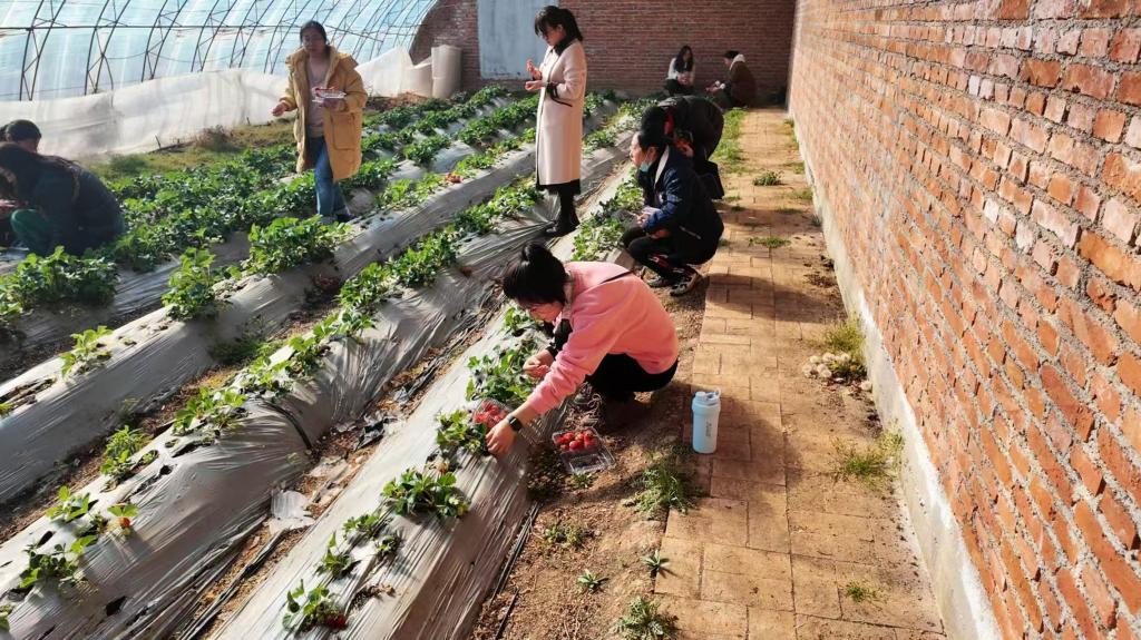 移步现代农业园区智慧采摘区,女教职工进入草莓温室大棚开展劳动实践,大家边采摘边用镜头记录精彩瞬间。