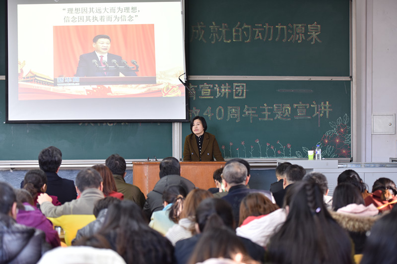 报告通过典型的人物示例,结合自身教学经验和人生思考,以铿锵有力的言辞为师生上了一堂精彩的教育课。从信仰、信念、理想的内涵,新时代中国共产党人的初心和使命,改革开放巨大成就的动力源泉——信仰的力量和怀疑的时代依然需要信仰四方面进行讲解,最后得出深刻的启示,信仰让我们精神快乐,信仰是我们行船的方向,信仰让我们活得更有价值。