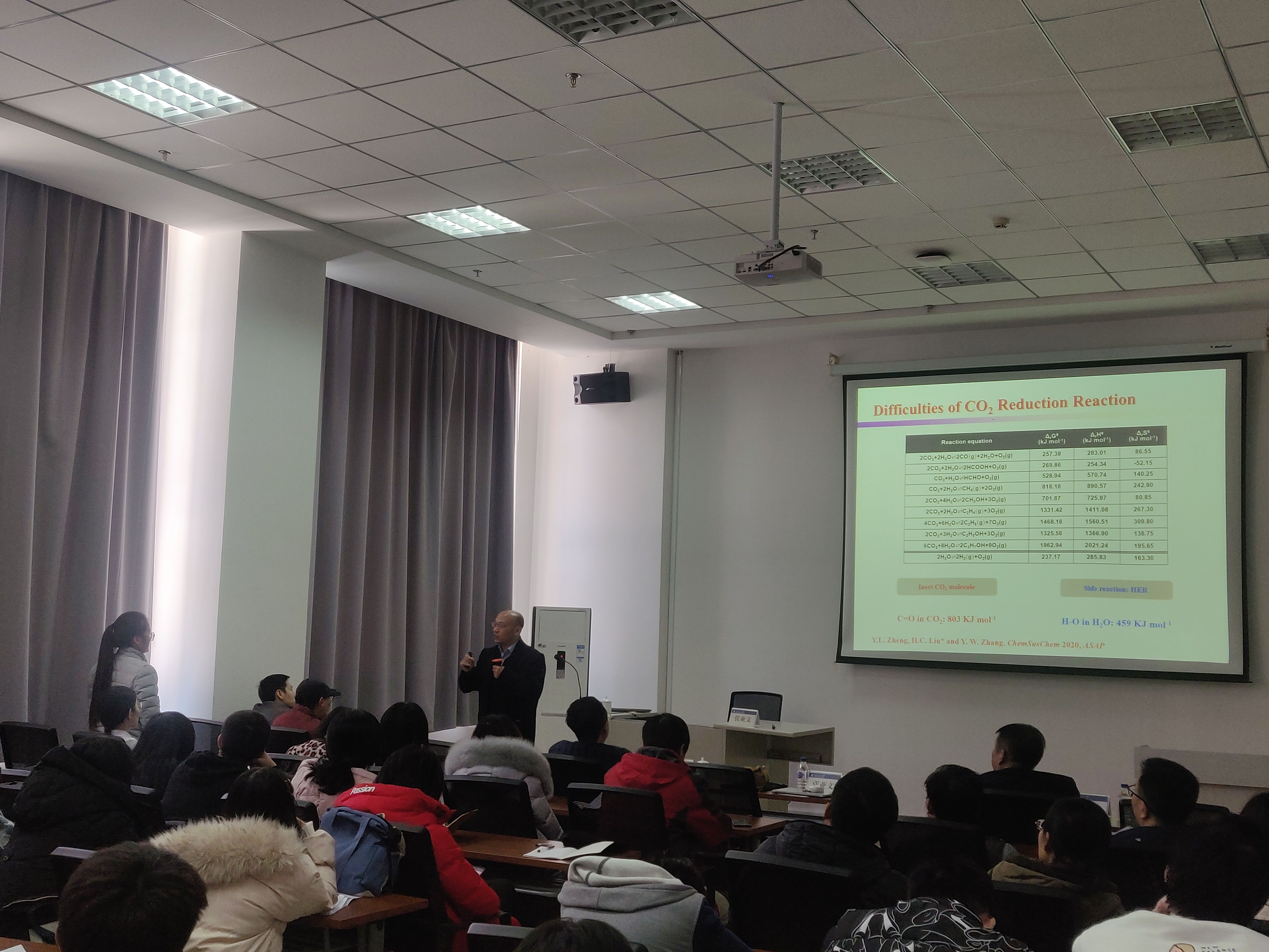 报告会上,张亚文教授首先简要介绍了二氧化碳定向催化转化的研究背景及需克服的难题,紧接着针对现阶段实现二氧化碳定向催化转化提出了两条思路:发展高选择性的催化材料和从理论的角度深入研究催化机理。之后,张亚文教授分别从热催化、电催化、光催化三个角度展示了自己团队在各方面的先进成果,为现场老师提供了全新的科研思路。