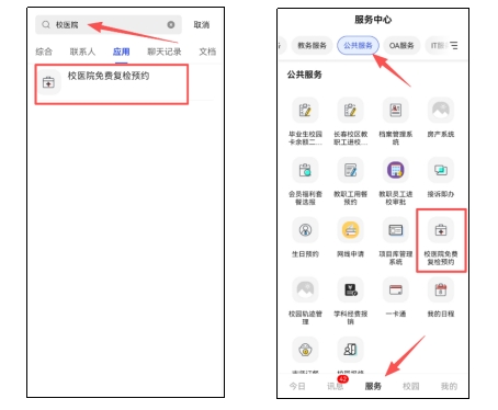 登录【今日校园】平台,在【服务】界面下拉刷新后,选择【公共服务】可看见【校医院免费复检预约】;或在此页面上方搜索【校医院免费复检预约】,进入【预约项目】进行相应的预约。预约后可通过【我的预约】查看、跟踪预约信息及审核通过情况。