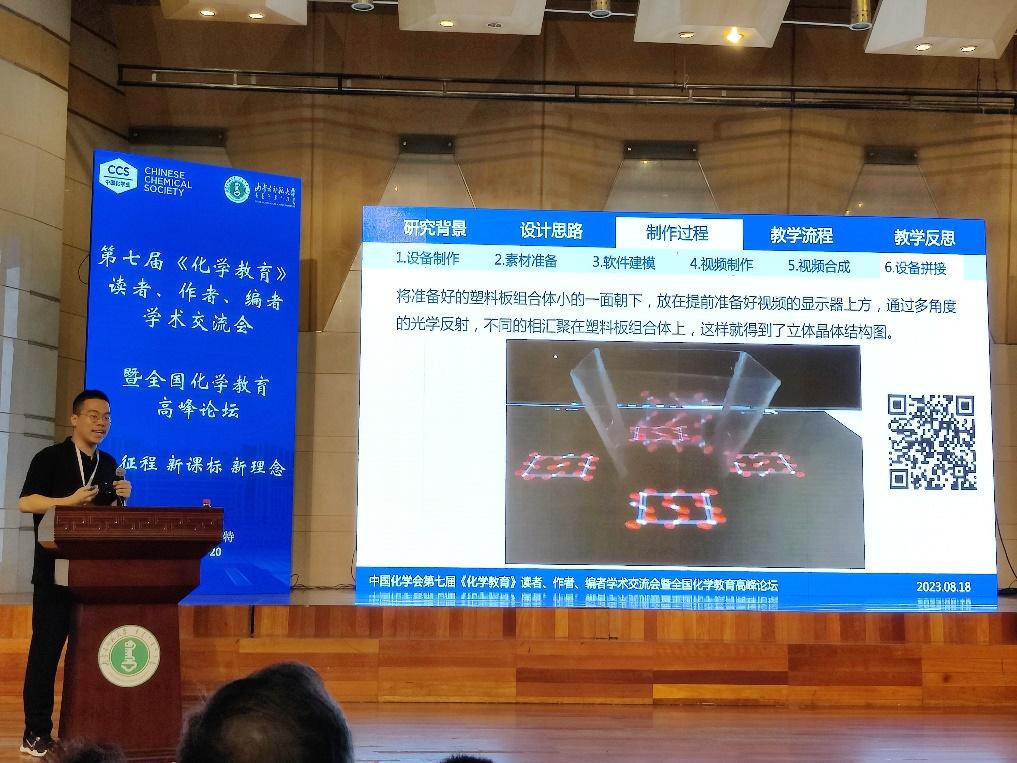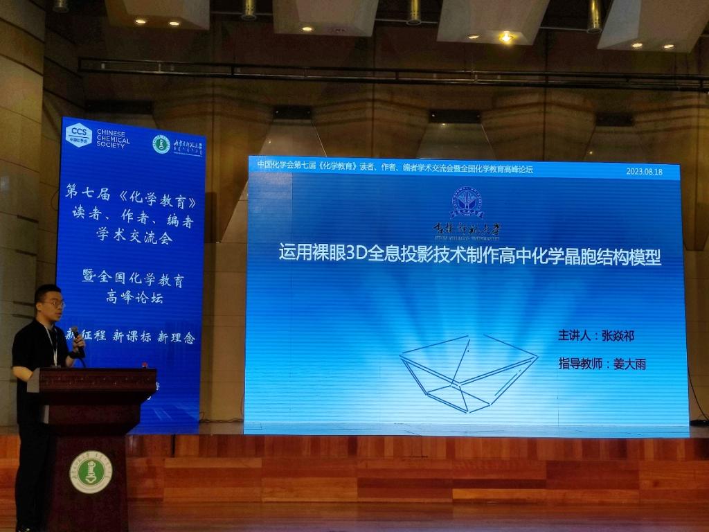2023年8月17—20日,由中国化学会主办、内蒙古师范大学承办的“新征程、新课标、新理念”第七届《化学教育》读者、作者、编者学术交流会暨全国化学教育高峰论坛在内蒙古师范大学举行。我院化学专业2021级学生张焱祁作为唯一的本科生代表获邀进行口头报告,报告题目为《运用裸眼3D全息投影技术制作高中化学晶胞结构模型》(指导教师:姜大雨)。