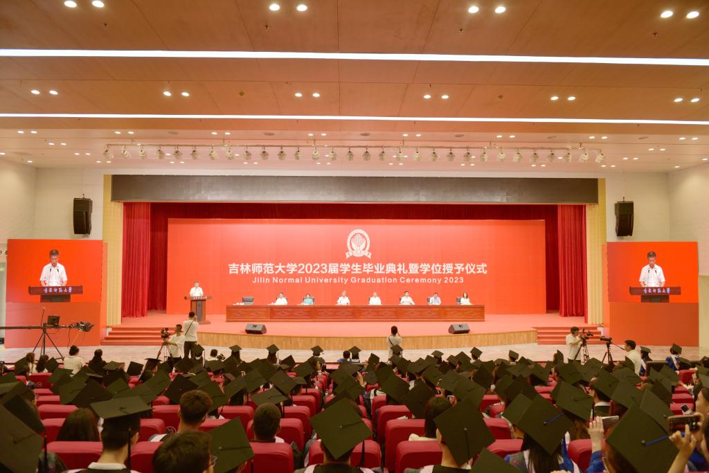 杨小天代表学校,向2023届4550名本科生、1235名研究生顺利完成学业表示热烈祝贺;向回母校参加毕业典礼的2020、2021、2022届毕业生表示热烈欢迎;向全体毕业生家长的理解和支持表示最衷心的感谢;向无私奉献的广大教职员工、大力支持学校发展的校友以及社会各界人士致以最崇高的敬意。他饱含深情的说,你们因选择与吉师结缘,因信任与吉师同行。在过去的几年里,国家的“成就”刷新着我们共同的“记忆”。无论过去、现在还是将来,你们都是祖国发展的见证者、受益者,是学校发展的亲历者、建设者,你们的命运和荣耀也将牢牢与祖国、与母校紧密联系在一起。临别之际,杨小天殷切寄语毕业生。一是要有理想。要始终牢记习近平总书记的殷切期望和明确要求,同国家和社会的需要紧密相连,与时代前进的方向同频共振,在强国建设、民族复兴的新征程上书写无愧于党、无愧于国家、无愧于人民、无愧于时代的青春华章。二是要敢担当。要坚持“敢”字当头,发挥专业优势和自身特长,在中国式现代化建设中挺膺担当,扛起属于你们这一代青年人的责任,为实现中华民族伟大复兴的中国梦释放无限的青春动能。三是要能吃苦。要磨砺能吃苦的品格和精神,善于打开工作局面,勇于挑战“卡脖子”技术,敢于开辟“从0到1”的无人之境,奔赴条件艰苦的基层、国家建设的一线、项目攻关的前沿,在全面建设社会主义现代化国家新征程中贡献更大的青春力量。四是要肯奋斗。要发扬革命加拼命的精神,砥砺实干加苦干的行动,用双手创造更加美好的生活,用脚步丈量我们的祖国大地,用眼睛发现中国精神,用耳朵倾听人民呼声,用内心感应时代脉搏,奔赴充满光荣和梦想的远征,点燃更加夺目的青春光彩。