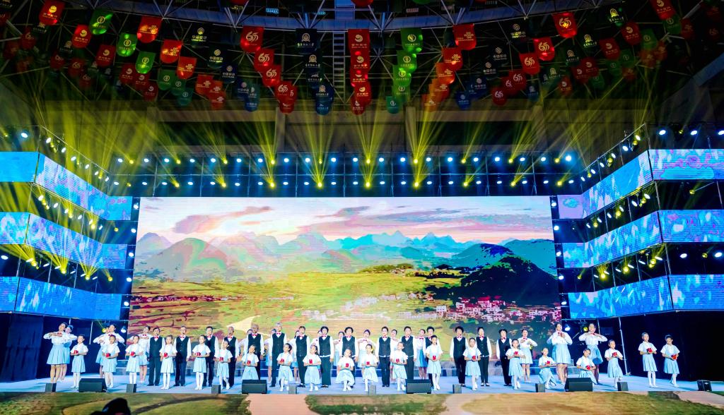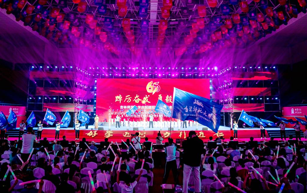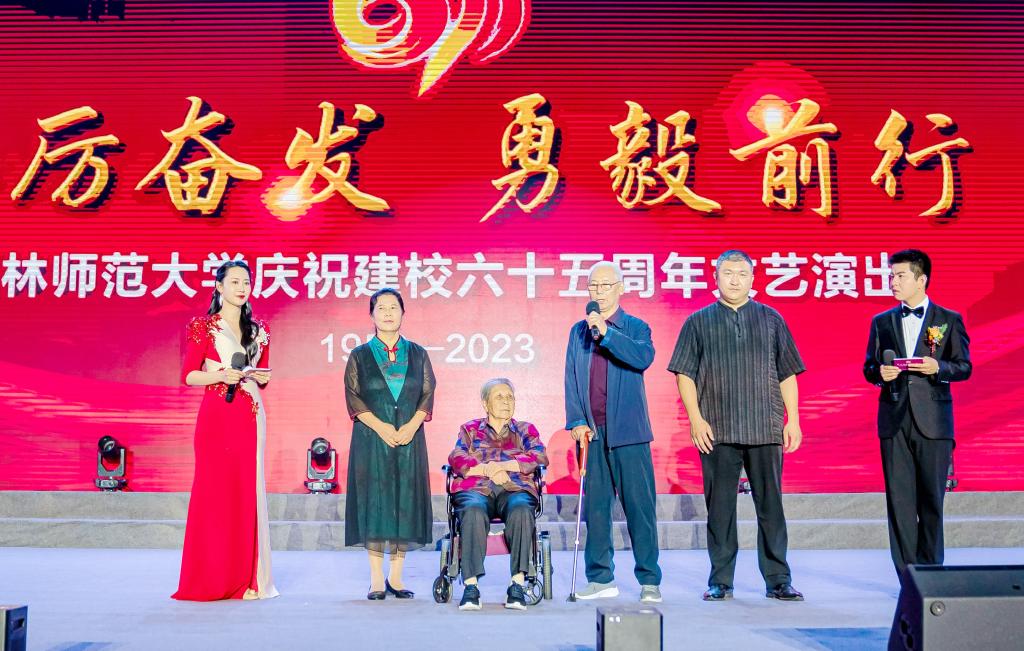 演出以歌舞、合唱、乐器演奏、创意舞蹈展示等多种形式全方位展示了全校师生拼搏进取、善于创新、自强不息的精神风貌。气势恢宏的学校65周年宣传片,立体呈现了吉师65年的光辉历程,彰显了吉师人为党育人、为国育才的不懈追求和深厚情怀;小合唱《我和我的祖国》,由退休教师、青年学生和少先队员三代人联袂演唱,深情表达了吉师人浓浓的爱国情和拳拳的报国心;校旗传递《弦歌永续》创意新颖,不同时期的校旗、17个学院的院旗在璀璨的聚光灯的映衬下熠熠生辉,生动表现了吉师人与学校荣辱与共,休戚相关的血肉深情。演出现场,荣获吉林省首届教育世家称号的陈铁楠老师一家人的感人采访,获得师生的阵阵掌声,新一代吉师人也将传承好、发扬好吉师师者的光荣传统,坚决扛起时代使命,展现青春担当,续写育人华章。歌伴舞《相亲相爱》,昭示着新时代的吉师人将继续勠力同心,苦干实干,朝着特色鲜明、多学科协调发展的高水平师范大学目标阔步前进。