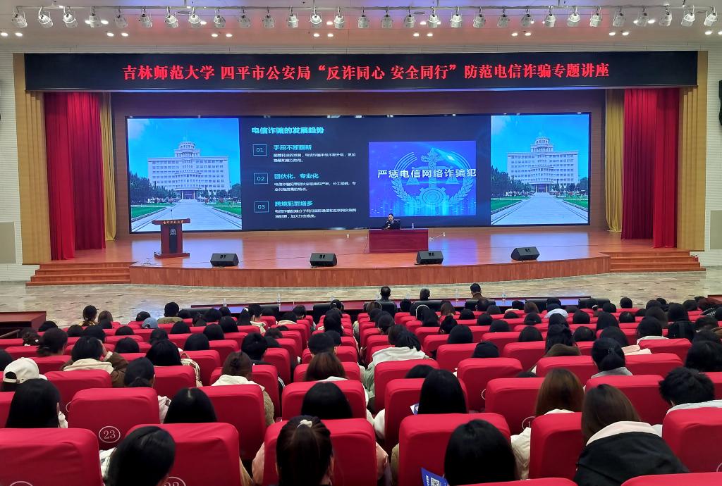 11月6日,学校联合四平市公安局在实习实训中心千人报告厅举办“反诈同心 安全同行”防范电信诈骗专题讲座,主讲人为四平市公安局反诈中心符蓉警官,学校相关职能部门负责人,各学院辅导员及新生代表共900余人参与此次活动。