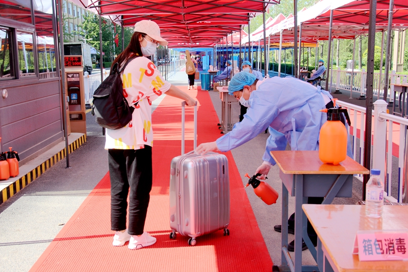 学生进入校门依次通过 “吉祥码”查验、体温检测、“今日校园”通行码查验、学生证查验、核酸检测等流程。学校开通多条入校通道办理入校查验手续,增设多辆行李运送车辆,实现学生与行李分流,在严格遵守疫情防控要求的基础上,最大程度地简化手续流程,极大提高了入校效率;开通“爱心大巴”,不间断发车,直达各学生公寓,全体工作人员全天候奋战在一线,以热情周到的服务迎接学生返校。学生严格按照返校流程自觉间隔一米有序入校,积极配合工作人员查验,现场井然有序。