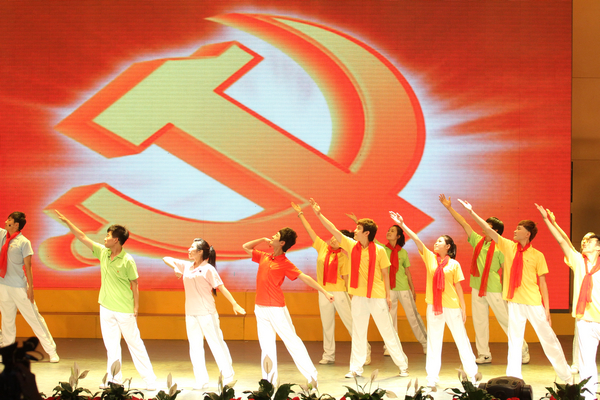 整场演出高潮迭起,精彩纷呈,气氛热烈。最后,校领导等同声演唱《没有共产党就没有新中国》、《团结就是力量》,台下观众全体起立和台上演职人员齐声合唱,代表28个基层党组织的旗帜在校旗的引领下环绕会场,辉映成一片红色的海洋。