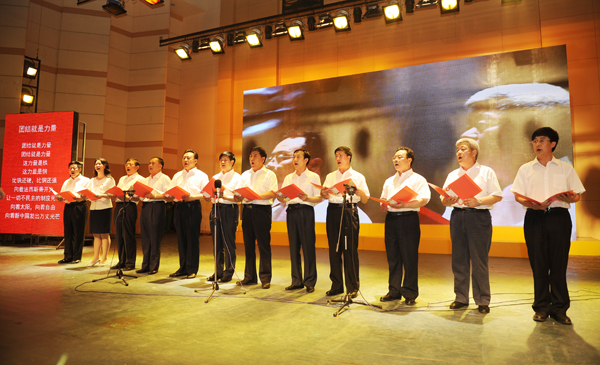 7月1日下午,音乐厅内华灯璀璨,喜气热烈,舞台屏幕“我们的旗帜”5个金色大字在党徽的映衬下熠熠生辉。bat365平台官网庆祝建党90周年“我们的旗帜”专题文艺演出在这里隆重举行。校党委书记张波,校长张伯军,党委副书记张振华、高林波,副校长齐奎、杨景海、祖国华、张勇,纪委书记王亮出席并观看了演出。副科级以上干部,副高级以上专业技术人员,民主党派负责人,关工委负责人,省市区级人大代表、政协委员,党员代表,“创先争优”受表彰人员共400余人观看了文艺演出。