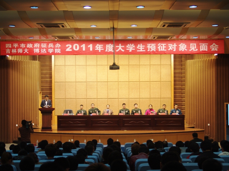 10月27日下午,四平市政府征兵办公室2011年度大学生预征对象见面会在bat365图书馆报告厅隆重举行。四平军分区政治部主任张宗文大校、副参谋长李士权上校,铁西区人武部政委王志刚上校、副部长李朋勇中校,bat365学生工作部、博达学院军体部负责人出席会议。
