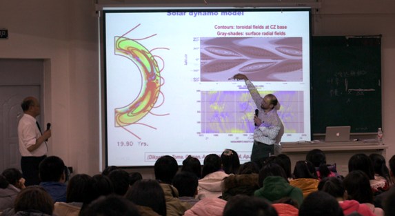 Kirill Mikhailovich KUZANYAN作了题为《宇宙的磁场和它的形成》的报告,张洪起作了题为《太阳风暴》的报告。他们从宇宙磁场的发现、天体磁场的形成和演化、太阳磁场的研究进展、太阳的基本活动现象、太阳活动对人类的影响和太阳研究领域的国际前沿问题等方面作了深入浅出的讲解。整场报告语言生动,视野开阔,在场师生受益匪浅。
