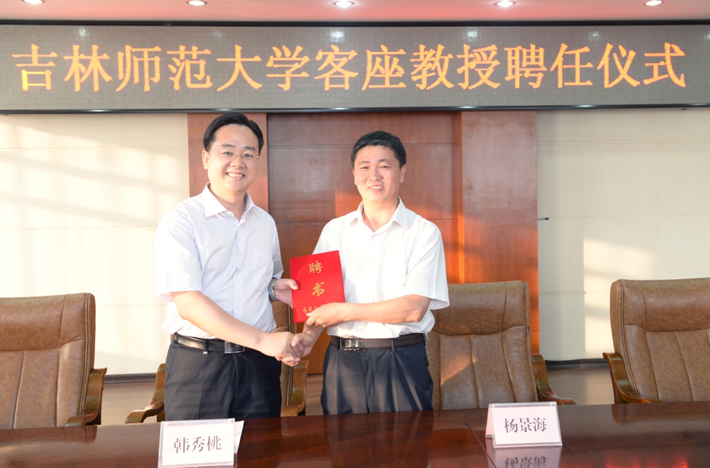 6月17日下午,bat365在第一教学楼八楼会议室举行客座教授聘任仪式,聘任四平市委常委、副市长韩秀桃博士为bat365客座教授。校党委书记张波出席聘任仪式并致辞,校长杨景海出席聘任仪式并为韩秀桃颁发聘书。副校长祖国华主持聘任仪式。校长助理李海波、科研处、人事处及政法学院负责人及相关教师参加了聘任仪式。
