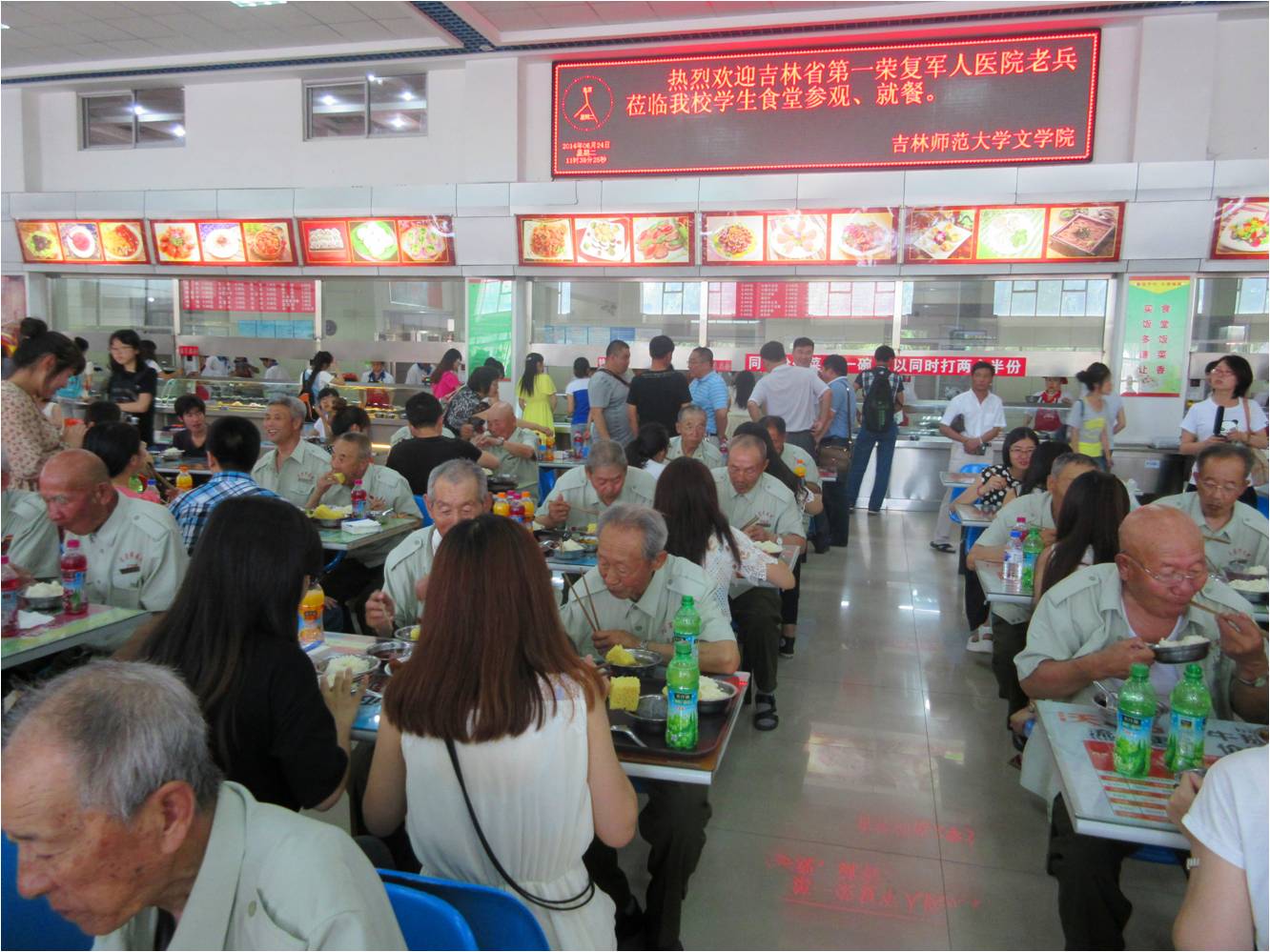 11时30分,20位老兵在学生代表“一对一”的陪同下来到学校食堂。面前摆放的是热乎乎的饭菜,身旁坐着的是充满朝气与希望的新时代大学生,每一位老兵的脸上都洋溢着温馨而满足的笑容。餐桌上有的不是拘谨与沉默,而是大家相互交谈与聊天的畅快,一顿简单的午饭让老兵与学生增进了了解,感受了真情。“这是我吃过的最有意义的一顿午饭。和老兵们坐在一起聊天并没有丝毫的陌生感,而是像和家中的爷爷奶奶交流一样,轻松自然。听到他们向我们讲解亲身经历的战争故事,我真的感慨颇多。现在国家稳定和谐了,我们应该尽自己的一份力量去关心与回报这些抗战老兵,真正把关怀落到实处,去体现一名大学生党员的真正价值。”学生代表侯天放说。