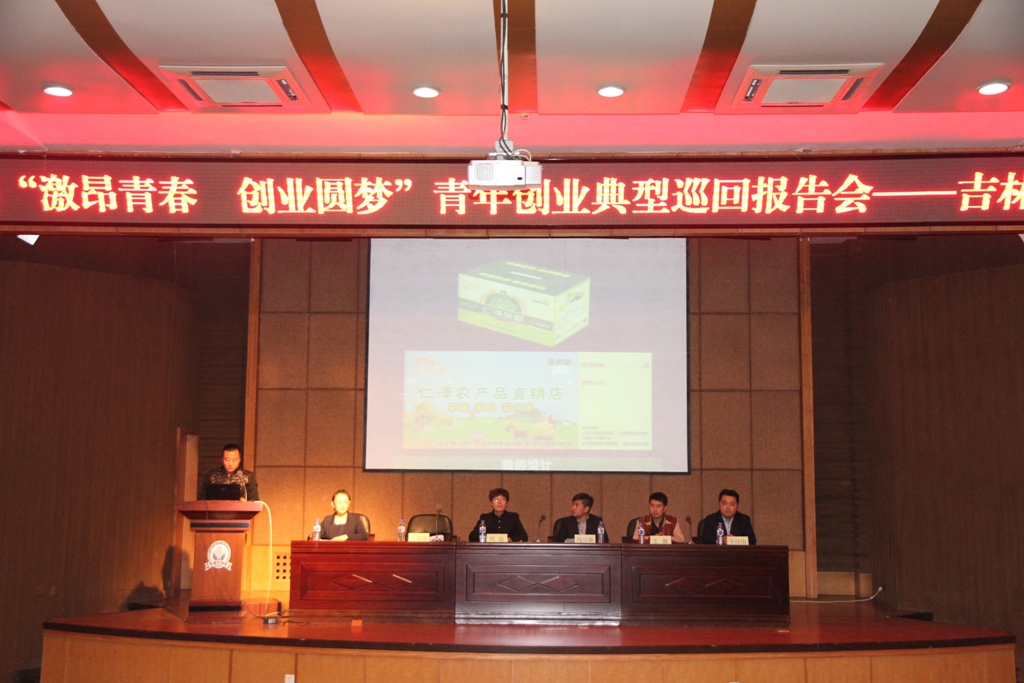 报告团成员为四平市四平任泽生态养殖专业合作社负责人王绪伟、四平市通通教育学校校长刘通、四平绿禾种业有限公司总经理冯思瀚、四平馨梅林居饭店经理王强、吉林省麦古网络科技有限公司经理王付山五位青年创业典型。会上五位企业家不仅和同学们分享了自己的创业事迹、向同学们介绍了创业经验、创业相关知识,同时也现场解答了同学们关心的创业问题,企业家的演讲和解答精彩、幽默,现场气氛热烈。