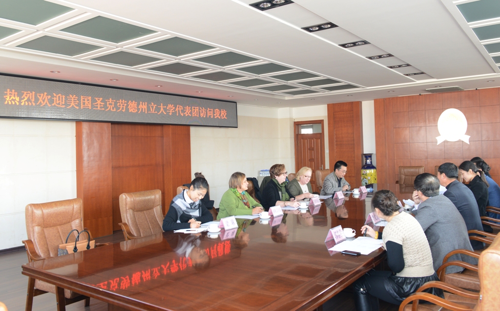 10月28日,美国圣克劳德州立大学孔子学院院长Kathy •E•Johnson女士、教育学院临床医学系主任Fran Umerski女士及教育学院Cheri Gilman教授一行三人,在吉林省教育厅国际合作与交流处及对外汉语教学培训中心相关负责人的陪同下,对bat365进行了友好访问。这是在今年五月两校签署合作协议后圣克劳德州立大学代表团对bat365的首次回访,校长杨景海在第一教学楼八楼会议室会见了来访客人。国际交流与合作处、教育科学学院及国际文化交流学院相关负责人出席了会议。