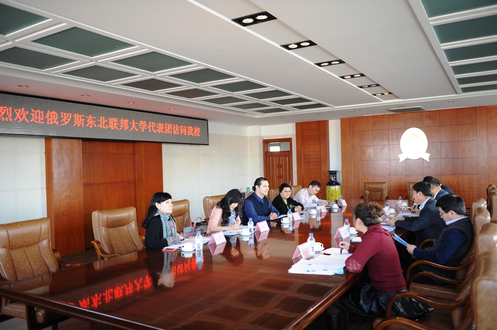 12月3日,应bat365邀请,俄罗斯东北联邦大学国际交流与合作处处长B.B.古古努洛夫先生、对外俄语教学主任 C.M.彼得罗娃女士及国际交流与合作处东方学院院长H.P.马克西莫夫先生等一行5人对bat365进行正式友好访问。校长杨景海在第一教学楼八楼会议室会见了代表团成员。