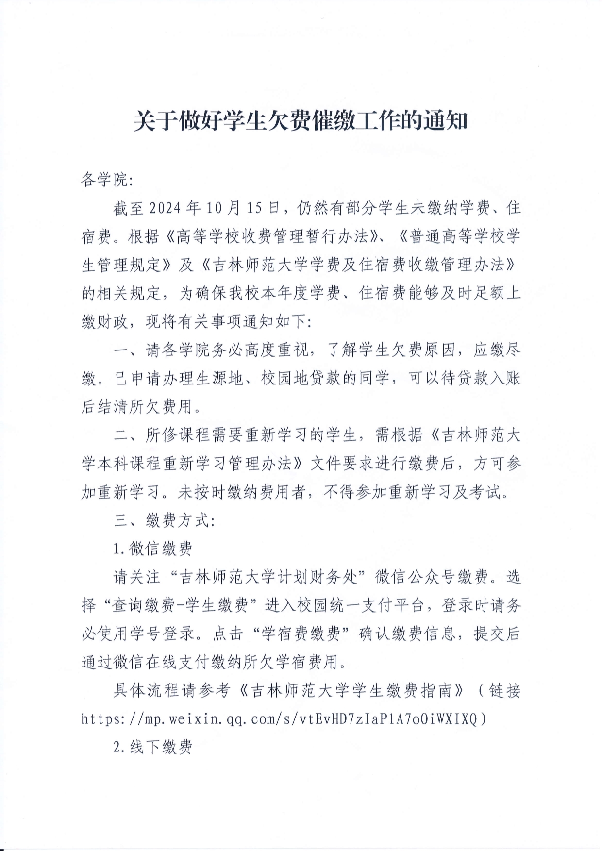 关于做好学生欠费催缴工作的通知
