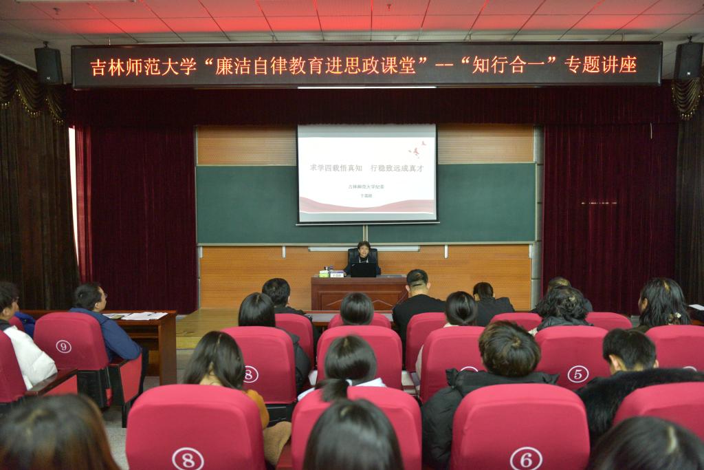 11月9日,学校在第十一教学楼举办“廉洁自律教育进思政课堂”——“知行合一”专题讲座。纪委书记、监察专员于荔欣为2020级学生讲授廉洁自律教育课。