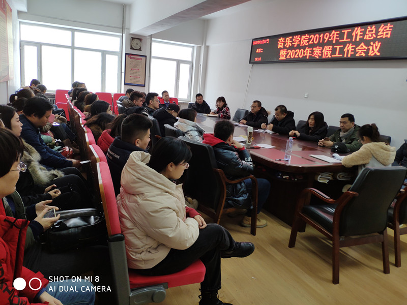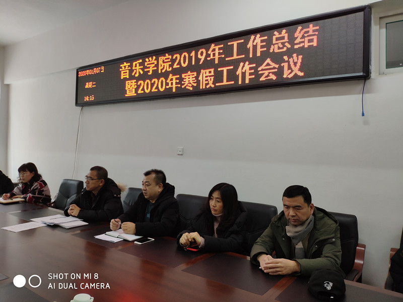 2020年1月7日下午,音乐学院在三楼会议室召开2019年工作总结暨2020年寒假工作会议。院长胡晓伟主持会议并讲话,党总支书记陈明宏作了讲话,副院长任会平、颜铁军、副书记楚学娟和全院教职员工参加了会议。