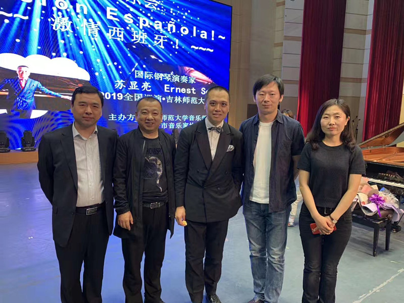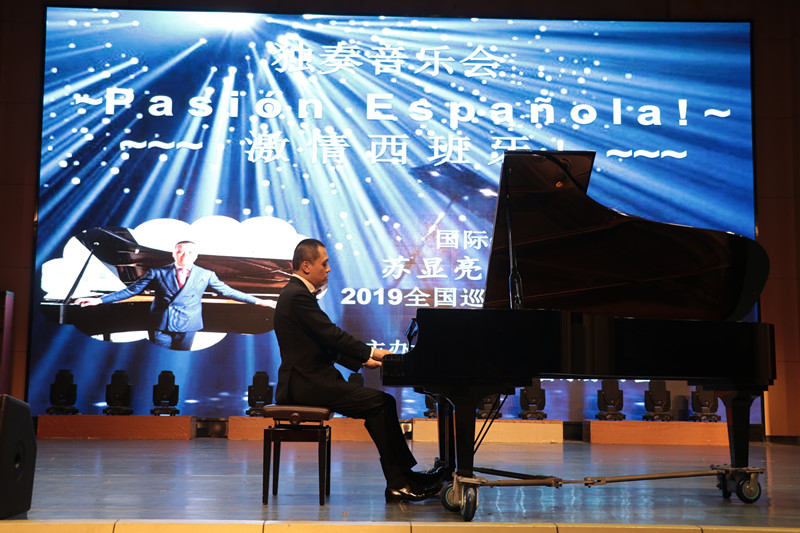 2019年5月16日晚,国际著名钢琴演奏家、我院客座教授苏显亮先生“2019中国巡演•bat365平台官网站”暨钢琴独奏音乐会《激情西班牙》在学校音乐厅举办。校党委书记许才山教授、副校长李海波教授、东北师范大学音乐学院钢琴系主任孟令帅博士、四平市音乐家协会主席刘成刚及学校一些单位领导和老师,我院党总支书记陈明宏、院长胡晓伟、副院长任会平、颜铁军及市里各界音乐爱好者、bat365师生500人共同欣赏了这场音乐盛宴。