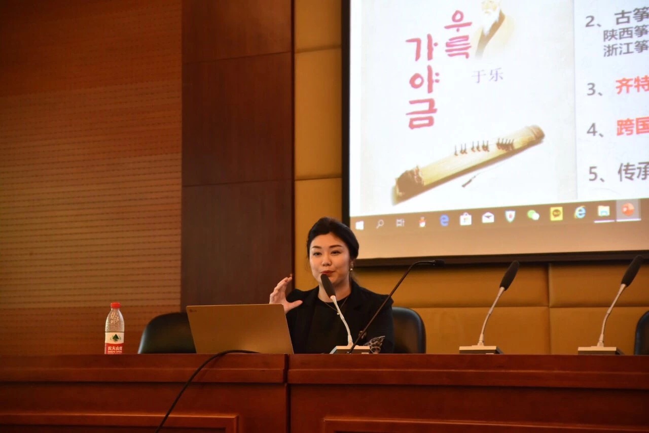 彭老师在下午举办的题为“伽倻琴与古筝的渊源”讲座中,通过历史文献讲解伽倻琴的来源,阐明伽倻琴和古筝同本同源的关系;通过展示图片介绍正乐伽倻琴、散调伽倻琴、二十五弦伽倻琴的形制、音乐特点和适用范围;通过播放视频展示朝鲜半岛地区和中国延边地区的伽倻琴演奏方式,使听众对不同形制的伽倻琴有深入的了解。