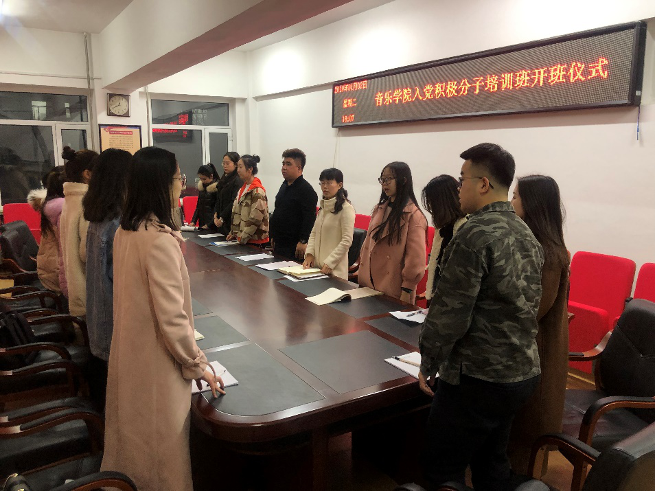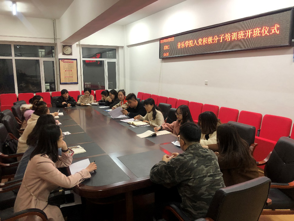 4月2日晚,音乐学院第35期入党积极分子培训班在学院三楼党员活动室举行开班仪式,院党总支副书记楚学娟主持并讲话,学生党支部书记王丹及16名入党积极分子参加。