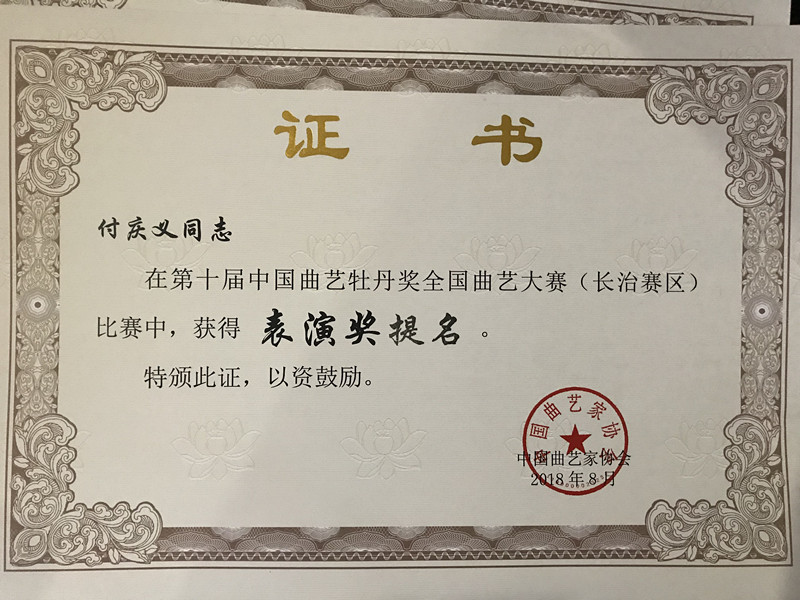 2018年8月11日,由中国文联、中国曲艺家协会主办的第十届中国曲艺牡丹奖全国曲艺大赛开赛,一场来自大江南北、韵味醇香的“曲艺盛宴”在山西省长治市拉开大幕,经过两天角逐评出牡丹奖表演奖、文学奖、节目奖、新人奖的提名。我院“长白山技能名师”付庆义教授导演并主演的二人转——《枫叶红了》参加大赛,荣获“表演奖提名奖”。