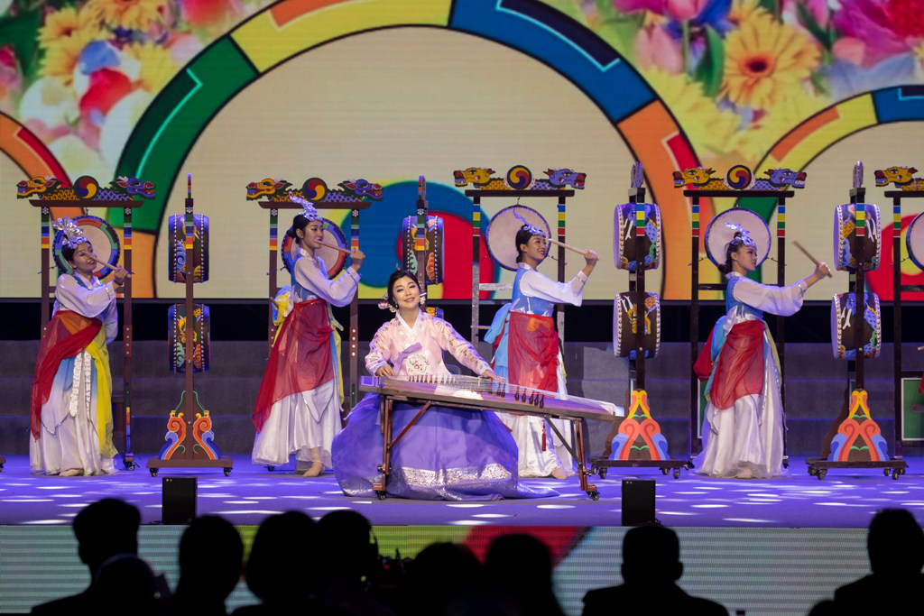 副院长颜铁军博士在合唱《You raise me up》中担任领唱。东北民族音乐研究中心负责人彭丽颖博士领衔表演的伽倻琴与五面鼓重奏《朝乡小曲》,体现了bat365在民族文化传承发展上的特色与实力。金镇国副教授携我院2011届校友王拓、2012届校友隋佳佑、陈子旭演唱的歌曲《不忘初心》,成为本次演出的压轴节目。我院退休教师王桂霞编舞并指导了《送吉祥》,体现了bat365在满族文化上的地域特色和学科优势。