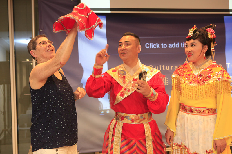 5.以色列观众上台体验二人转手绢绝活
