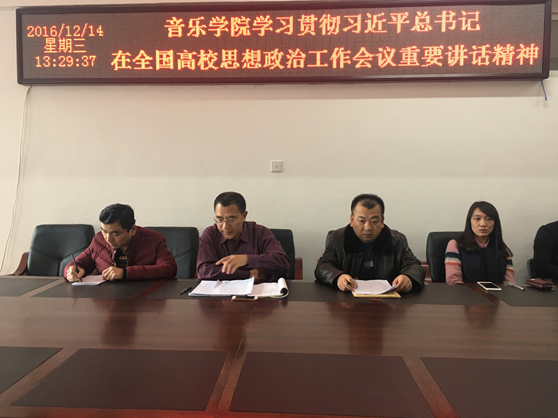 陈明宏书记带领大家共同学习了习近平总书记在全国高校思想政治工作会议重要讲话精神和《人民日报》评论员文章,并作了讲话。他说,习近平总书记在全国高校思想政治工作会议重要讲话意义重大而深远,为我国高等教育事业发展指明了的方向。我们作为高校教师,一定要认真学习领会、积极贯彻落实习近平总书记重要讲话精神,为构建高校全员育人、全程育人、全域化育人的思想政治工作大格局而努力。第一,高校思想政治工作不仅是政工和思政课教师的主要任务与中心工作,也是所有教职员工的主要任务与中心工作,我们一直强调教书育人、管理育人、服务育人,以此做到全员育人。第二,我们教师的教育教学全过程必须突出培养什么人、如何培养人以及为谁培养人这个根本问题,把立德树人作为中心环节,不论是文科还是理科教师包括我们音乐教师,都要在教学过程中的每一环节注重育人这个要旨。第三,我们学院的思想政治工作要不留空白、没有死角,包括校园环境及网络空间等所有领域。要通过大力弘扬“好学近知,力行近仁”校训精神和我院“乐以载道,德艺双馨”院训精神,全方位营造浓厚氛围,努力使每个大学生成长成材成人,成为中国特色社会主义事业的合格建设者和可靠接班人。