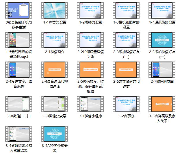 本课程遵循贴近生活、图文并茂、简单易学原则,围绕智能手机的常用功能、如何使用手机微信、数字生活之小程序和app等内容,通过直观、生动、易懂的短视频动画,为老年朋友讲解智能手机日常应用,助力老年朋友跨越数字鸿沟、开启数字生活。