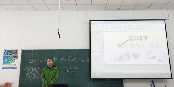 会上,王立分析了教师资格证的考试背景和项目情况,介绍了教师资格证的工作流程,笔试和面试的具体要求。韩强从学生管理的角度提出要把教师资格证作为今后各项学生工作考核推优等一切评比的重要参考,鼓励大家争取一次性通过。张宏和柏松结合学院专业提出了做好教师资格证应考的具体措施并对近期教师资格证的培训工作做出部署。2014级侯瑛楠、2015级周铂奥两位同学用自己的亲身经历给同学们介绍经验。范立君从加强新时期教师队伍专业化建设的高度提出两点意见:一是学院高度重视教师资格证培训工作,二是学院会提供强有力的帮助,营造一切备考氛围。希望同学们及早准备,认真备考,努力应战。