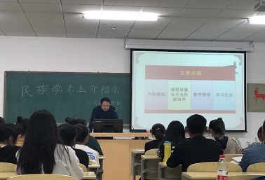 在民族学专业介绍会中,副教授邱广军首先对民族学专业学生表示强烈激励,并且重点介绍了民族学就业的光明前景。邱广军老师将学校的制度以及民族学考研情况进行了详细的介绍,从而加深了2019级新生对于学院乃至学校的了