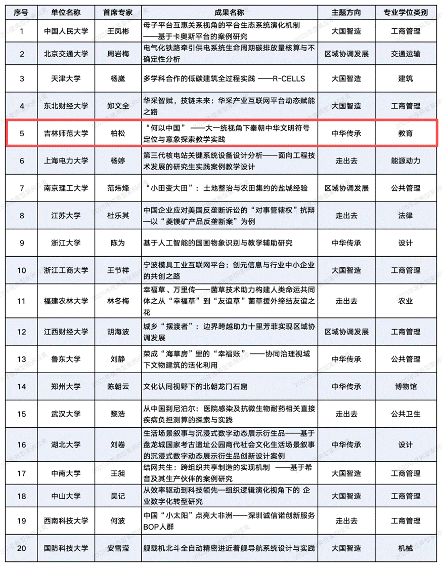 近日,教育部学位与研究生教育发展中心对2025年度典型案例成果进行公示。我院柏松老师提交的主题案例《“何以中国”——大一统视角下秦朝中华文明符号定位与意象探索》从全国1459篇收录入库的优秀案例中脱颖而出,被评为全国20篇主题案例典型成果之一。该案例不仅是教育专业学位领域唯一获评的典型案例,也是吉林省唯一入选的案例成果。