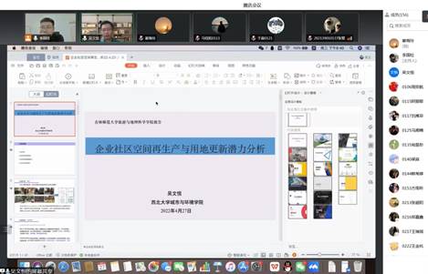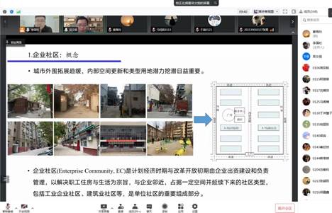 报告会上,吴文恒教授首先就企业社区已有研究的关注焦点进行了概述,国际上的研究关注中东欧、苏联、中国等社会主义国家的单位住房变化,涉及社区变革、治理建设等方面;国内的研究集中在社区变迁变革、社区治理与建设、职住关系等方面。吴文恒教授围绕企业社区空间再生产和企业社区用地更新潜力进行了重点阐述。企业社区空间再生产,特指我国市场经济改革以及国企改革、住房改革等一系列内外因素和力量作用下,企业社区在原场所或以其为主体的区域空间表现出来的物质、社会、精神等方面的重新建构,由同质同构转向同质异构,体现资本、权利、政策、政府的影响作用。企业社区用地更新潜力,指响应精明增长与节约集约用地,面向城市更新、街区振兴和老旧小区改造的需要,在城市、片区、街区或单体尺度上企业社区所能提供的用地更新数量和质量状况,包括用地面积更新潜力、用地集约利用潜力等。最后,吴文恒教授从整治改善、保护性开发、再开发三个方面探讨了企业社区的未来发展。报告结束后,吴文恒教授与线上参会师生进行了深入的交流。