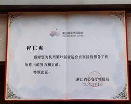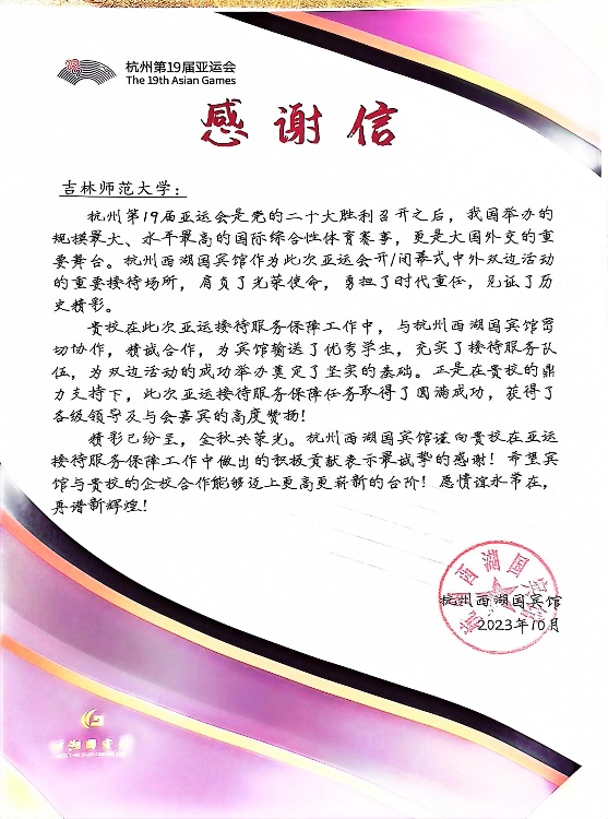 在杭州亚运会期间,我院在杭州西湖国宾馆实习的程任爽、朱培铭等8名学生在接待服务保障工作中做出突出贡献,浙江省公安厅特勤局特别为我院发来感谢信。