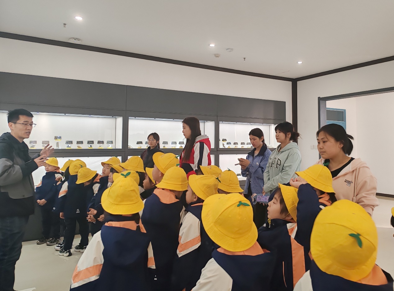 活动当日,基地精心规划了符合幼儿认知特点的参观路线,讲解员化身亲切的“地球故事讲述者”,以童趣满满的语言,带领孩子们漫步地球演化长廊。系列矿物岩石及古生物化石标本点燃了孩子们的热情,激发了孩子们的奇思妙想,现场充满了孩子们活跃的讨论声;在游戏化的体验过程中,每一次观察、每一次触摸,都像是孩子们与地球奥秘的一次亲密对话。此次活动通过沉浸式体验与趣味互动的形式,为学龄前儿童播撒下科学启蒙的种子,让孩子们在欢乐中感受地球的神奇魅力。
