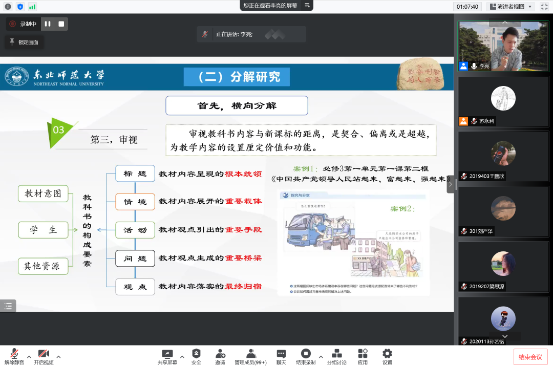 教学目标是教学的起点和归宿,4月18日,学院邀请东北师范大学政法学院思想政治教育系主任李春会老师通过腾讯会议做了“基于核心素养的中学思政课教学目标的设计和实施”专题讲座,经过李老师专业的讲解,同学们对教学目标有了更深入的认知,教学目标设计是落实学科核心素养的关键环节,学科核心素养是教师拟定教学目标的指南。基于核心素养视域下的教学目标的制定能够帮助未来作为准教师的我们把立德树人根本任务落到实处。